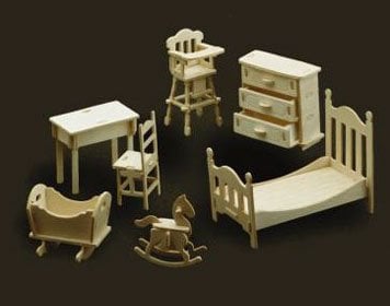Woodcraft poppenhuis kinderkamer meubeltjes. Bouw set van licht houten kinderkamer meubels voor in een poppenhuis. Geschikt vanaf 6 jaar. Ongelakt. Schaal: 1 op 12.